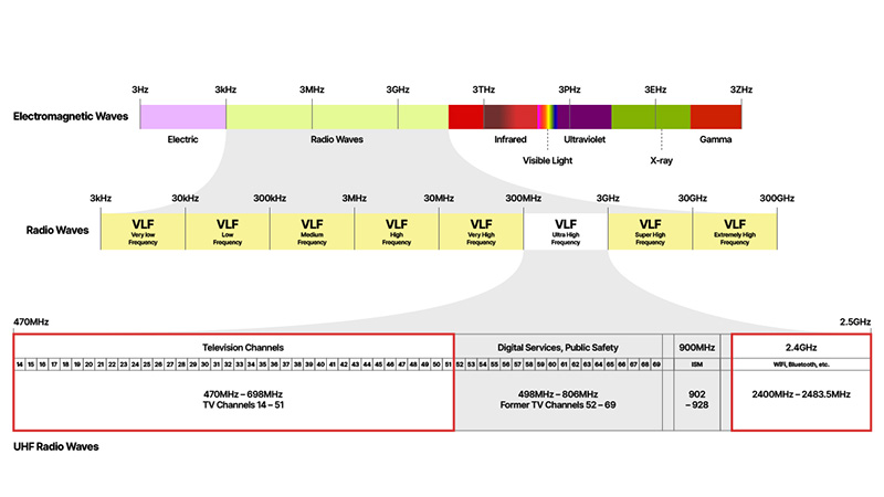 大多数可用频道位于 470 MHz 至 700 MHz 范围内。2.4 GHz 频段主要用于 Wi-Fi;不过,免授权麦克风也可以在此频段使用。一些曾经用于其他用途的频率,例如无绳电话 (DECT),现在也已开放用于无线麦克风。这些频率涵盖 1.4 GHz、1.6 GHz 和 1.9 GHz,以及 6-10 GHz 频段的一部分。